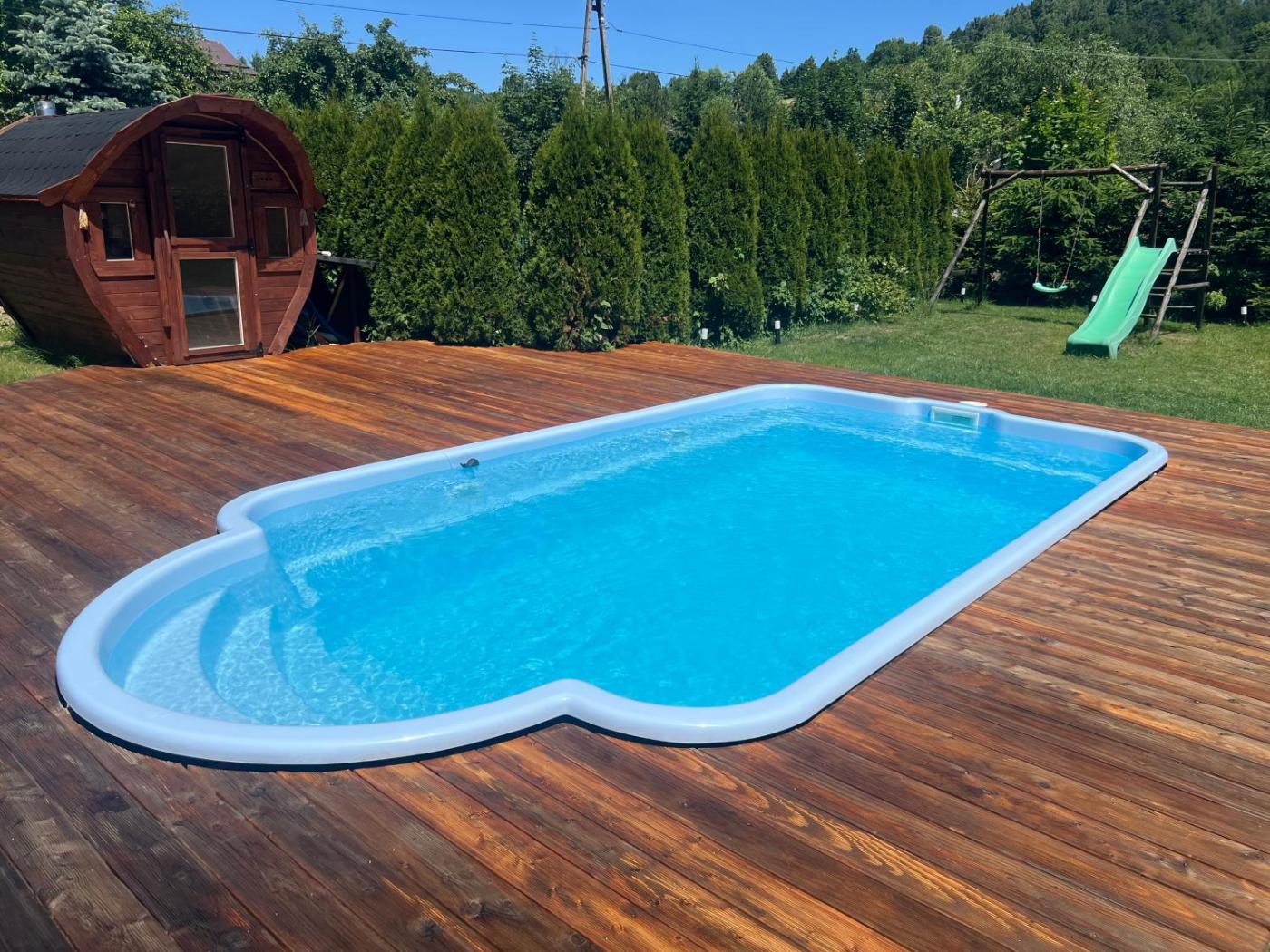 Domek. This chalet features a private pool and a sauna. Boasting a private entrance, this spacious chalet also features 1 living room, 4 separate bedrooms and 4 bathrooms with a walk-in shower. Guests will find a stovetop, a refrigerator, kitchenware and an oven in the well-fitted kitchen. The chalet also comes with a barbecue. The chalet has parquet floors, a seating area with a flat-screen TV, a dining area, an electric kettle as well as garden views. The unit has 11 beds. Domek - 15 osobowy. Powierzchnia pokoju ok.: 120 mkw.