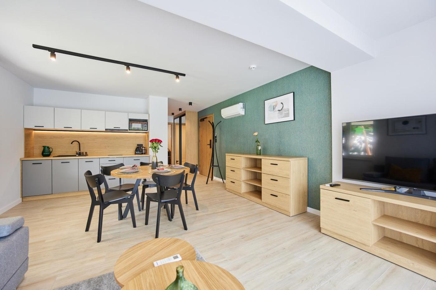 Apartament z widokiem na góry. Boasting a private entrance, this air-conditioned apartment includes 1 living room, 1 separate bedroom and 1 bathroom with a walk-in shower and a hairdryer. In the fully equipped kitchenette, guests will find a stovetop, a refrigerator, a dishwasher and kitchenware. Featuring a terrace with garden views, this apartment also offers a tea and coffee maker and a flat-screen TV. The unit has 3 beds. Apartament - 5 osobowy. Powierzchnia pokoju ok.: 52 mkw. ;