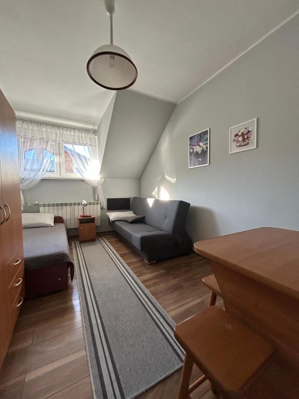 Studio. The studio provides an electric kettle and a sofa, as well as a private bathroom featuring a shower. Guests can make meals in the kitchenette that is equipped with a stovetop, a refrigerator, kitchenware and a microwave. The studio features parquet floors, a seating area with a flat-screen TV, a dining area, a wardrobe as well as garden views. The unit offers 4 beds. Studio - 5 osobowy. Powierzchnia pokoju ok.: 21 mkw.