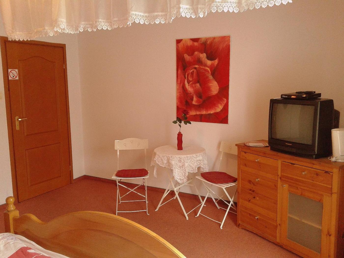 Pokój dwuosobowy typu Standard. The double room features a tea and coffee maker, a wardrobe, as well as a private bathroom boasting a walk-in shower and a hairdryer. This double room has parquet floors, heating, a flat-screen TV and garden views. The unit has 1 bed. Pokój Dwuosobowy - 2 osobowy. Powierzchnia pokoju ok.: 18 mkw. ;